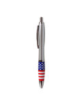 • Retractable curvy barrel ballpoint pen with patriotic-themed American flag stock art grip